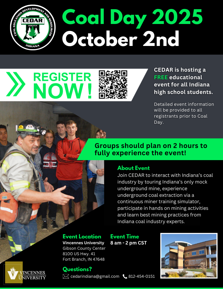 CEDAR invites you to interact with Indiana’s coal industry by touring Indiana’s only mock underground mine, experience underground coal extraction via a continuous miner training simulator, participate in hands on mining activities and learn best mining practices from Indiana coal industry experts. Learn firsthand the benefits and opportunities associated with Indiana coal production.